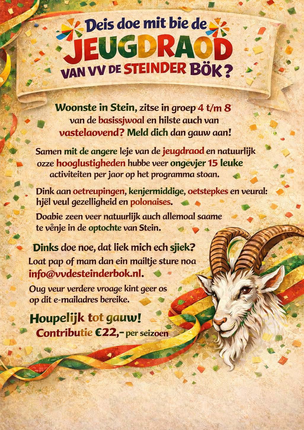 Want wea de betouvering van vastelaovend op jônge leaftied immers al mitkrieg, is later auch zeker ontvankelijk d’rveur. De Steinder Bök houpe veural dat op dees maneer ein fundament weurt gelag veur ein nuuj lichting vastelaovesgekke, prinsen en optochdeilnummers. De “kleine” raod is bie väöl kènjeractiviteite in het Steinse, maer auch daoboete present zwoa wie jeugdzittingen, sjwoalebezeuk en kènjerbals. Natuurlik geit dees feestbende mit op de jeugdprinsewage in de kènjer- en grwoate optochte! Baovendien make weer same altied ein zomeroetstepke.